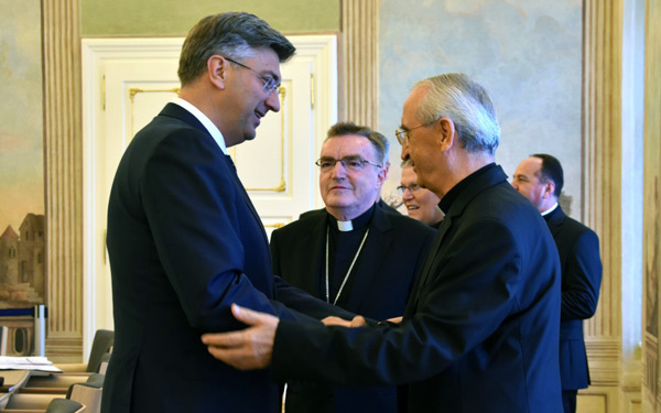 Premijer Plenković primio je nadbiskupa zadarskog i predsjednika Hrvatske biskupske konferencije mons. Želimira Puljića, nadbiskupa zagrebačkog i kardinala mons. Josipa Bozanića, nadbiskupa đakovačko-osječkog mons. Đuru Hranića, biskupa porečkog i pulskog mons. Dražena Kutlešu te biskupa hvarskog i generalnog tajnika Hrvatske biskupske konferencije mons. Petra Palića.