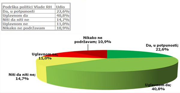 Razina potpore radu i politici Vlade iznosi 63,4%, dok je protivljenje izrazilo 21,9% ispitanika. 32,3% građana smatra da Hrvatske ide u dobrom smjeru, što je povećanje u odnosu na 27,5% u studenome, dok 55,2% ispitanika ne podupire smjer kretanja zemlje, što je manje nego u studenome kada je tako razmišljalo njih 56,8 posto.