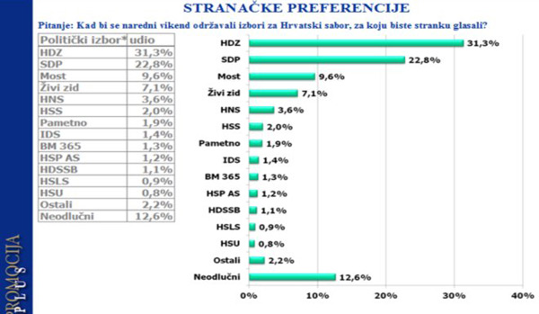 Da su parlamentarni izbori provedeni početkom travnja, HDZ bi bio pobjednik po izboru 31,3% građana (prema 32,8% iz ožujka). Drugi je SDP s 22,8% (prema 21,6% iz ožujka), a slijede MOST s 9,6%, Živi zid sa 7,1% i ostale stranke.