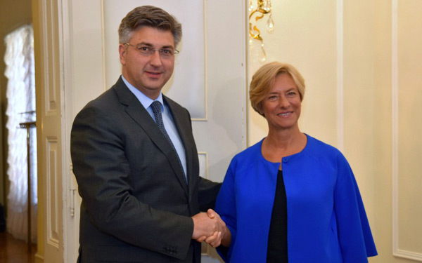 Premijer Andrej Plenković primio je posjet talijanske ministrice obrane Roberte Pinotti. Uz njega je bio potpredsjednik Vlade i ministar obrane Damir Krstičević.