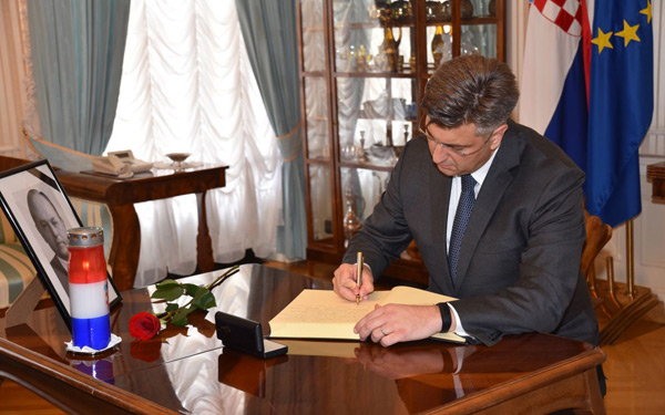 Premijer Andrej Plenković upisao se u knjigu žalosti koja je u Banskim dvorima otvorena u povodu smrti bivšega predsjednika Vlade Hrvoja Šarinića