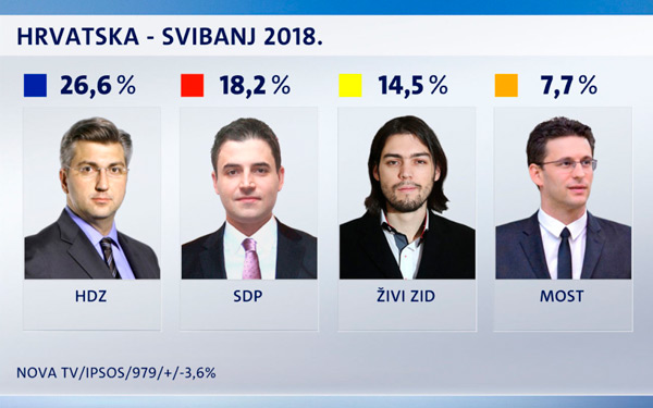 Potpora vodećem HDZ-u u svibnju iznosi 26,6 % (u travnju 27,6%), dok je SDP drugi s podrškom od 18,2% (u travnju 18%), a slijede Živi zid sa 14,5% (u travnju 13,8%) i MOST sa 7,6% (u travnju 7,1%), HSS sa 3,6%, Bandić Milan 365 sa 3,5% potpore te ostale stranke.