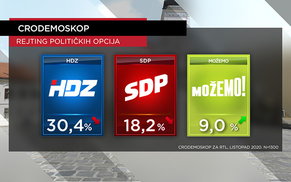 Prema CRO Demoskopu, na vrhu ljestvice preferencija političkih stranaka nalazi se HDZ s izborom od 30,4% ispitanika (prema 32,8% iz rujna). SDP je drugi i bilježi potporu od 18,2% (prema 18,4% iz rujna), a slijedi Možemo s 9%, Most s 8,4% te Domovinski pokret Miroslava Škore s 8,2%.