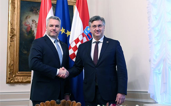 Predsjednik Vlade Andrej Plenković primio je danas austrijskoga saveznog kancelara Karla Nehammera, koji je prvi put u službenom posjetu Hrvatskoj u svojstvu kancelara