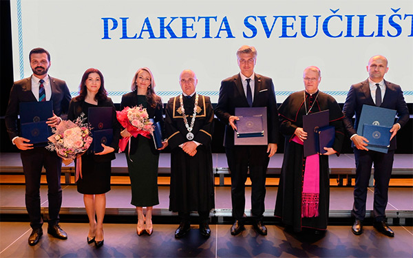 Zaslužnim pojedincima i ustanovama na sjednici su dodijeljena sveučilišna priznanja, a dodjelu Plakete osječkog Sveučilišta premijeru Andreju Plenkoviću rektor osječkoga Sveučilišta Vlado Guberac je obrazložio iznimnim doprinosom obnovi i razvoju osječkog Sveučilišta, odnosno značajnom financijskom i drugom podrškom u izgradnji studentskog paviljona u sveučilišnom kampusu.