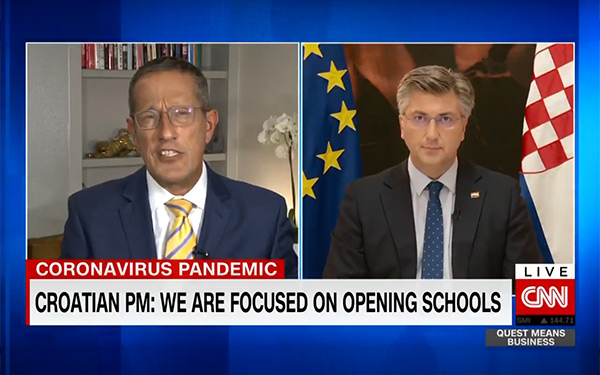 U CNN-ovoj poslovnoj emisiji »Quest Means Business« novinara i voditelja Richarda Questa predsjednik Vlade Andrej Plenković govorio je o balansiranju gospodarskih aktivnosti i strogih epidemioloških mjera